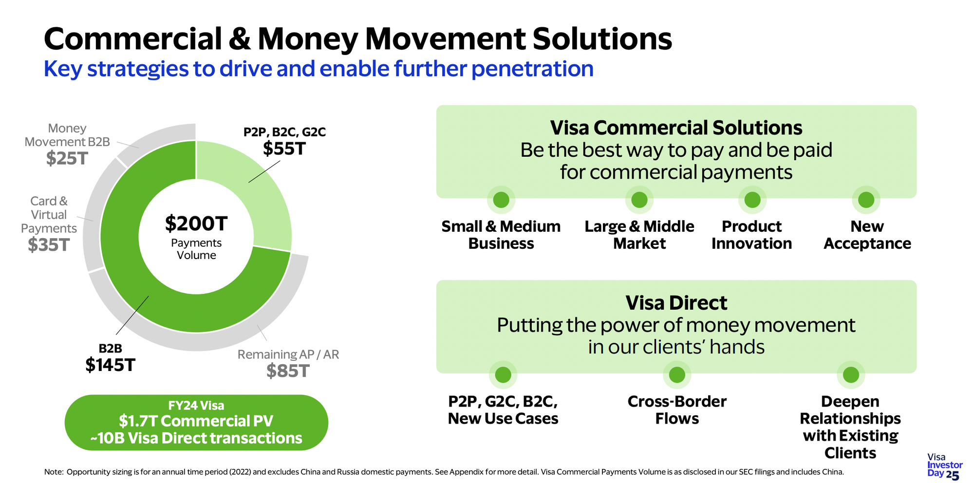 Visa sees a $200 trillion annual opportunity here (just to be clear, it's payment volume, not revenue), with $35 trillion in commercial card payments, and $165 trillion in money movement (think B2B payments, payouts, AP/AR). To pursue the money movement opportunity, Visa is ready to move beyond cards. Thus, the cornerstone of Visa's offering in commercial payments is Visa Direct, a group of products powering payouts, peer-to-peer transfers, and cross-border payments. Companies like Cash App and PayPal already use Visa Direct for moving money domestically.