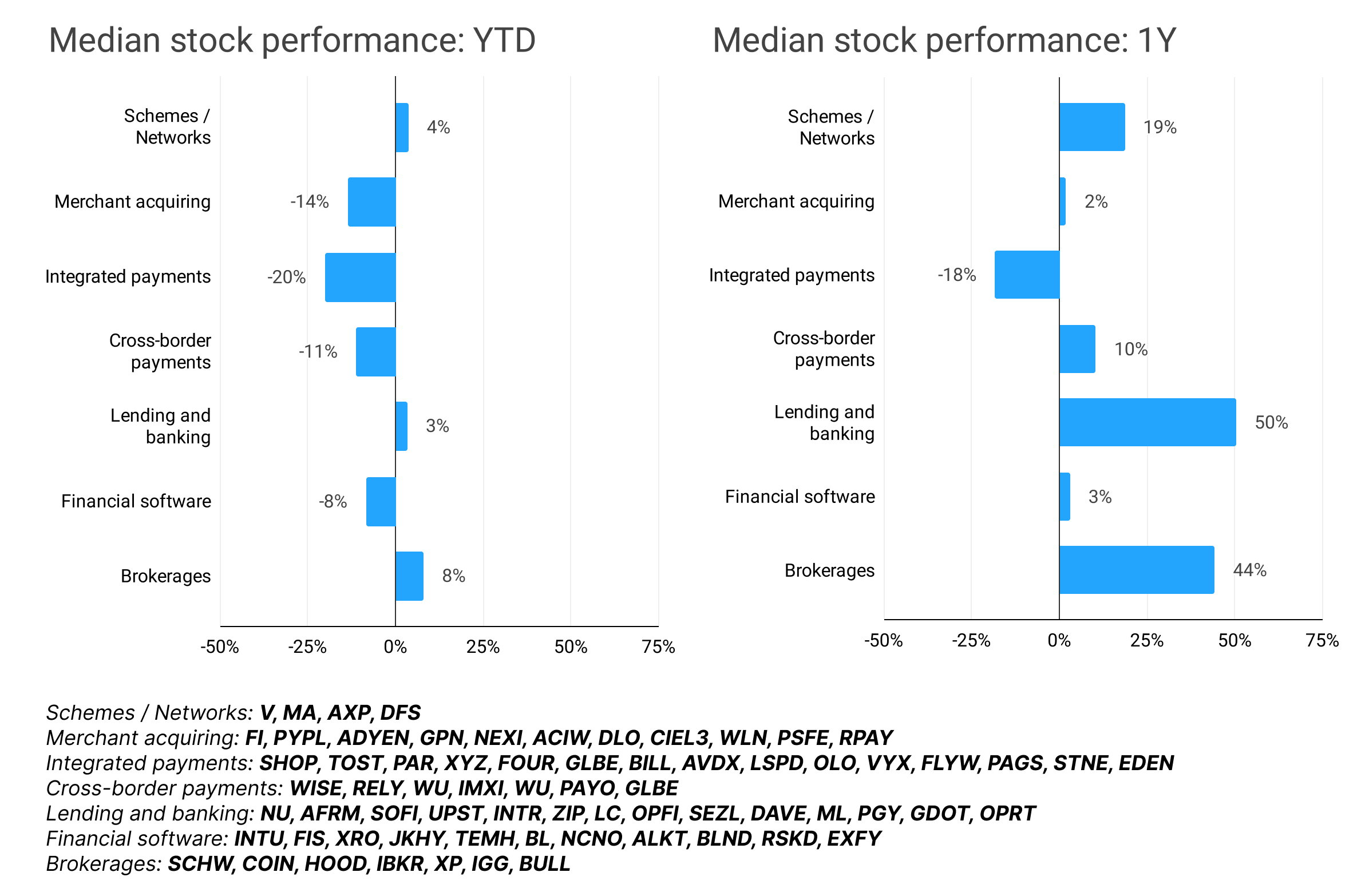 This year, we decided to introduce new sections: stock performance and valuation multiples by category. Putting fintech companies into "buckets" is no trivial task, so please treat these sections as a "work in progress". We're also happy to hear feedback!