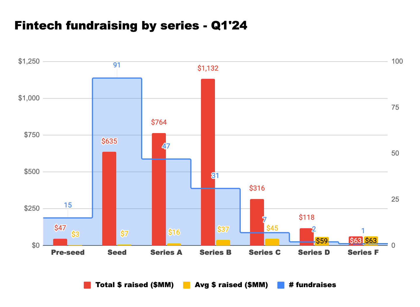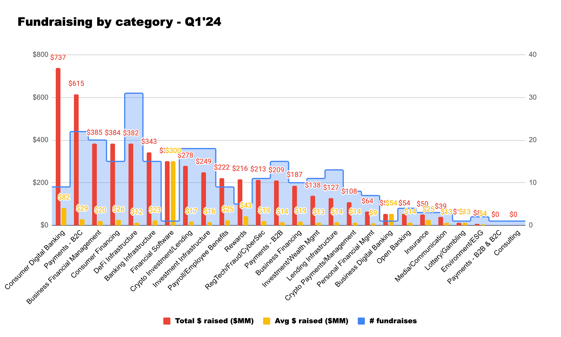 Fintechs raised a total of $5.37 billion in Q1, down 25% from the prior quarter and down 56% Year-over-Year. Though the number of rounds raised was up 10% QoQ, the average size of each raise shrank 32% QoQ.