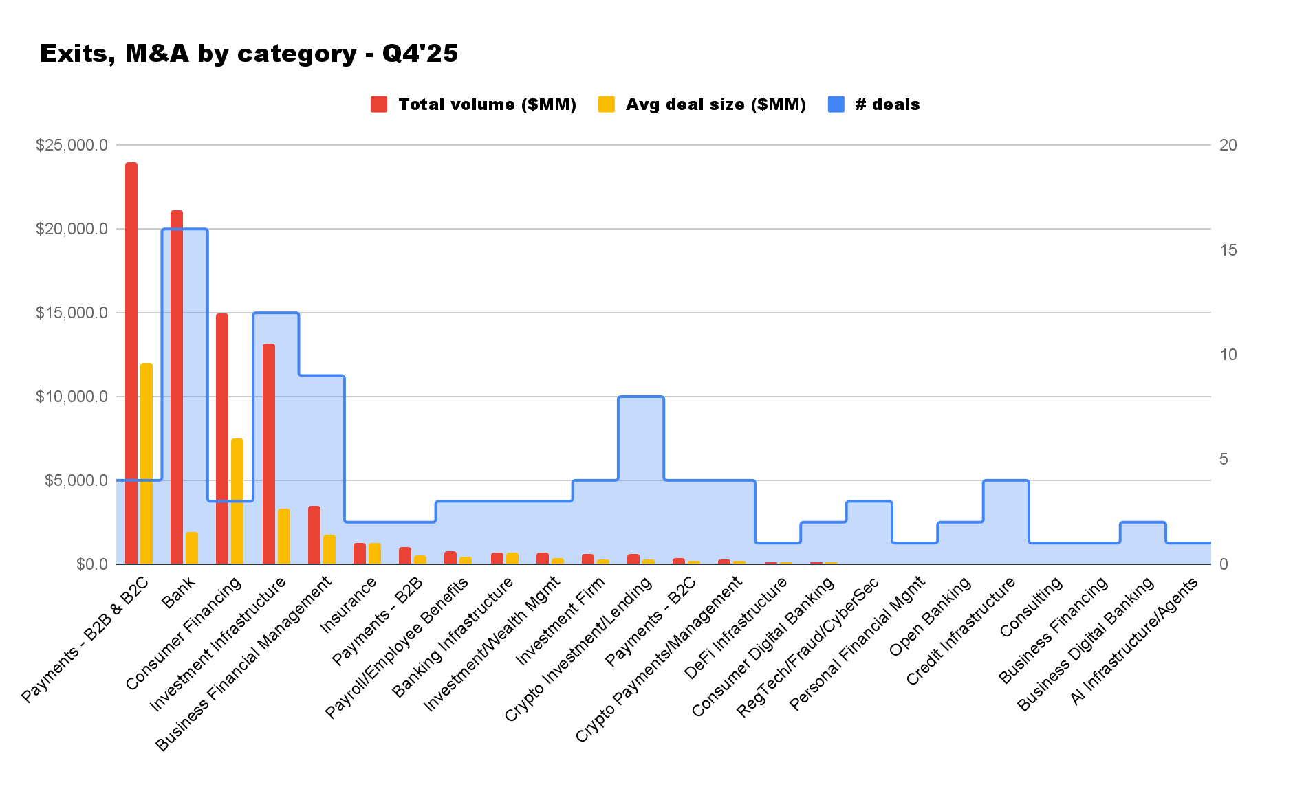• Payments infrastructure continues to consolidate as increasingly fragmented rails, growing fraud losses, and compressing fees push payment providers to expand horizontally (adding new payment methods) and vertically (integrated financial suites, value-add features…). In Q4, Global Payments purchased Worldpay from GTCR and FIS for $22.7 billion to form one of the largest merchant acquirers globally; Mollie acquired GoCardless for €1.1 billion to deliver a unified pan-European payment stack; Stripe bought B2B billing platform Metronome for $1 billion; Modern Treasury acquired stablecoin paytech Beam for $40M, and Worldline divested its North American subsidiaries to Shift4, its CoreOrchestration platform to Incore Invest, and its electronic data management unit to SIX