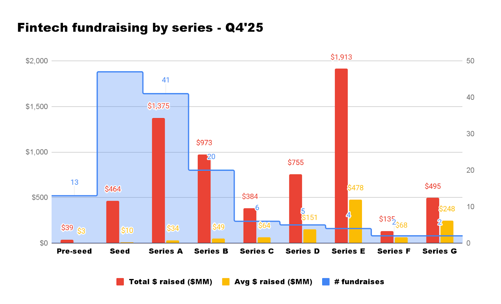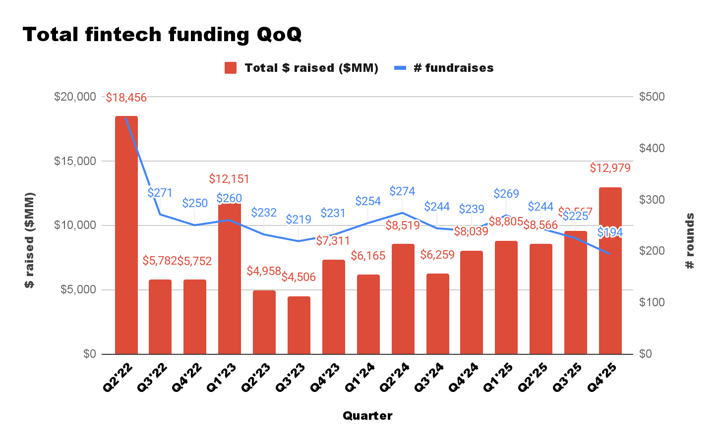 Total fintech funding rose 36% from the prior quarter to $12.98 billion in Q4 (a 61% jump Year-over-Year), fueled by over a dozen Series D-Series G megarounds. The number of equity raises was down 14% QoQ (⬇️19% YoY), bringing average deal size up 57% QoQ (⬆️11% YoY).