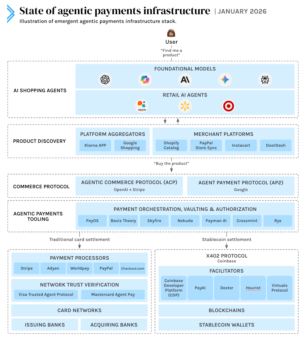 While there are still a lot of open questions around how AI agents can be trusted to complete purchases on your behalf (who bears liability if an agent buys the wrong thing? Who handles those disputes?), recent pilots give us a pretty clear idea of what the agentic payments flow will look like– and the players defining each layer of the stack…