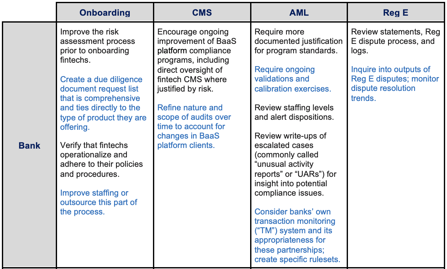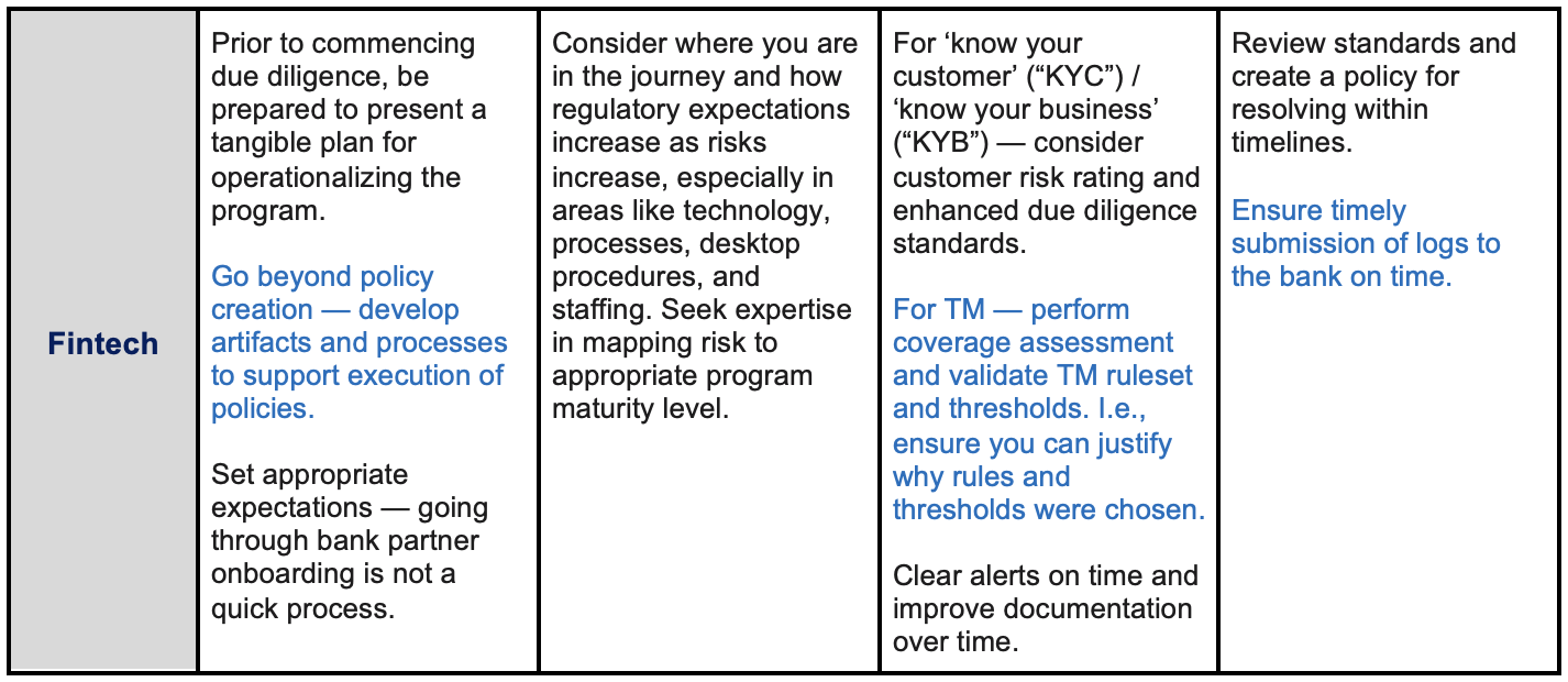 Now, some good news. Although regulatory scrutiny is increasing, there are ways each of the market participants mentioned throughout this article can help inspire regulatory confidence in these partnerships. The table below illustrates, at a high level, how fintechs and banks should think about building programs that withstand regulatory scrutiny in the areas of concern.