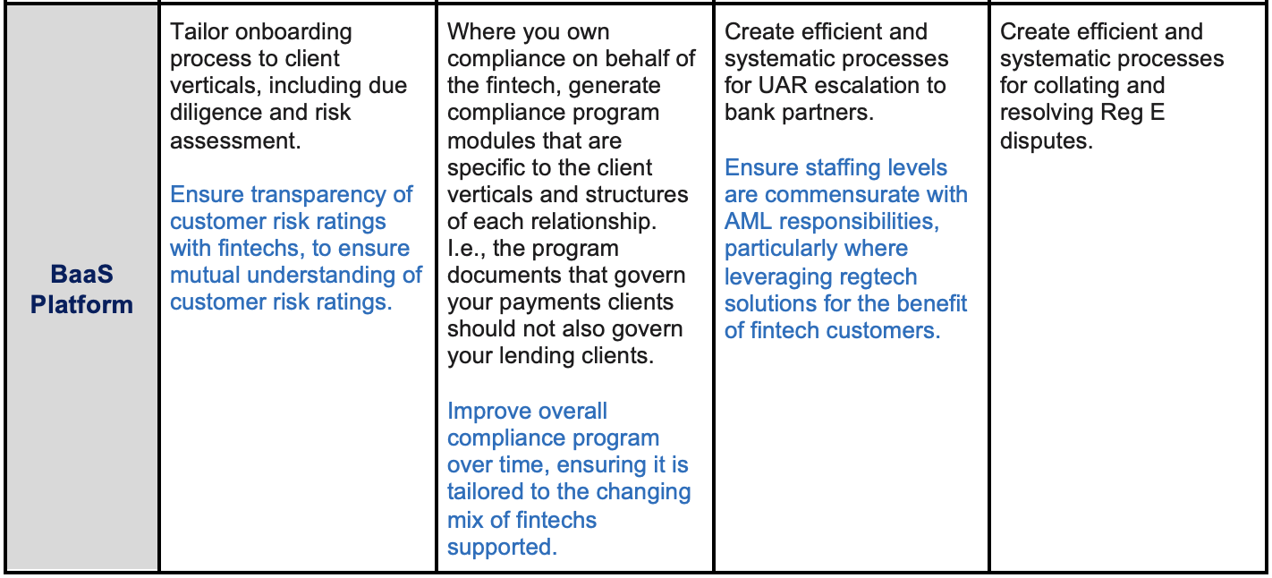 This confusion can be compounded by the growth in capabilities of ‘regtech’ tools, which seek to expedite and automate many aspects of regulatory compliance. While these tools can be efficient, effective, and – in many cases – necessary, fintechs and BaaS platforms too often consider the adoption of a generic written policy and the acquisition of a regtech solution as satisfaction of their regulatory expectations. Then, instead of tailoring procedures and calibrating tools specific to each use case, some BaaS platforms adopt a one-size-fits-all approach. The end result is a ‘RACI’ matrix showing a bank that is not responsible or accountable, and a fintech that is not consulted or informed.