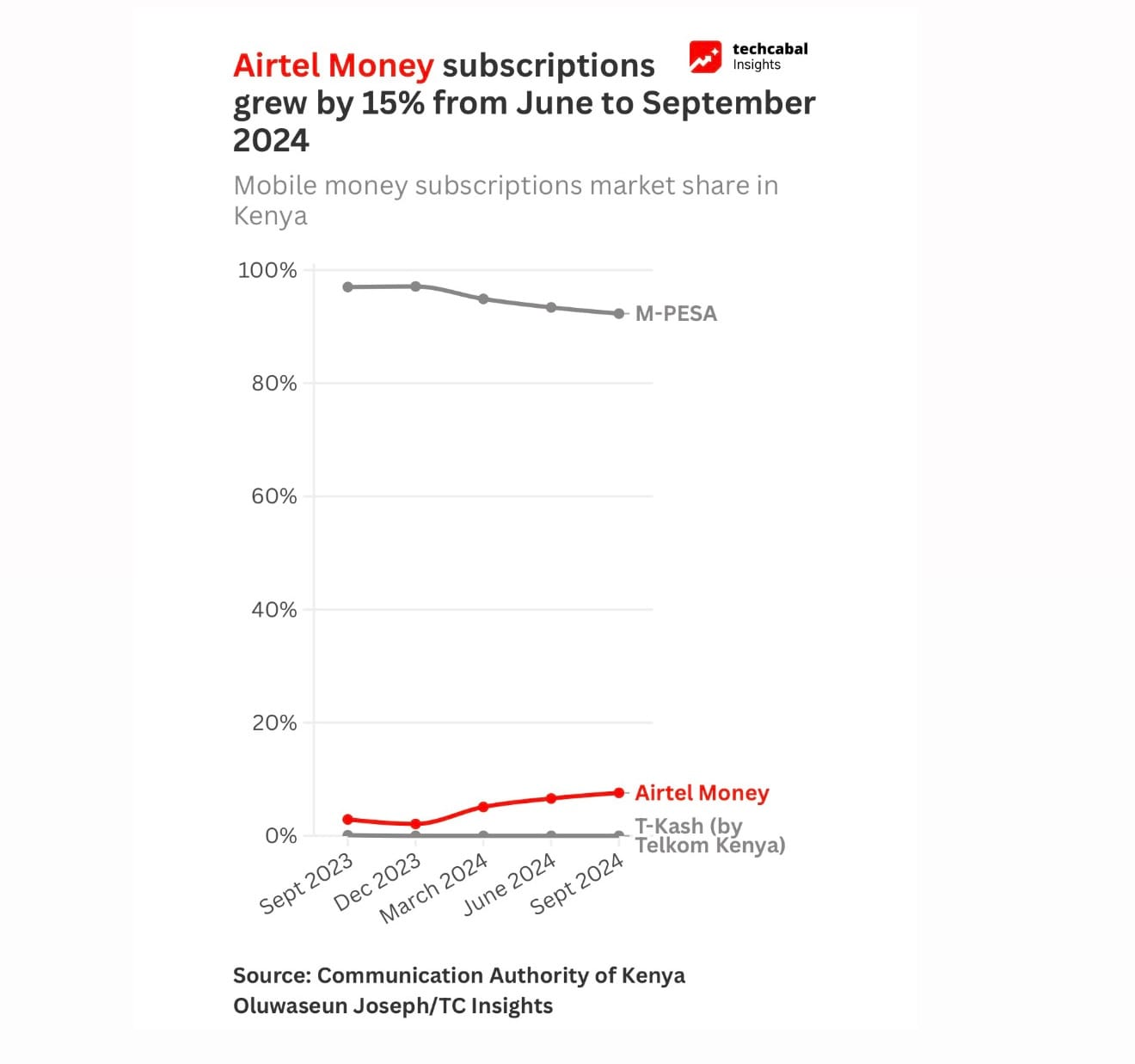 Airtel Money subscriptions grew by 15% from June to September 2024.
