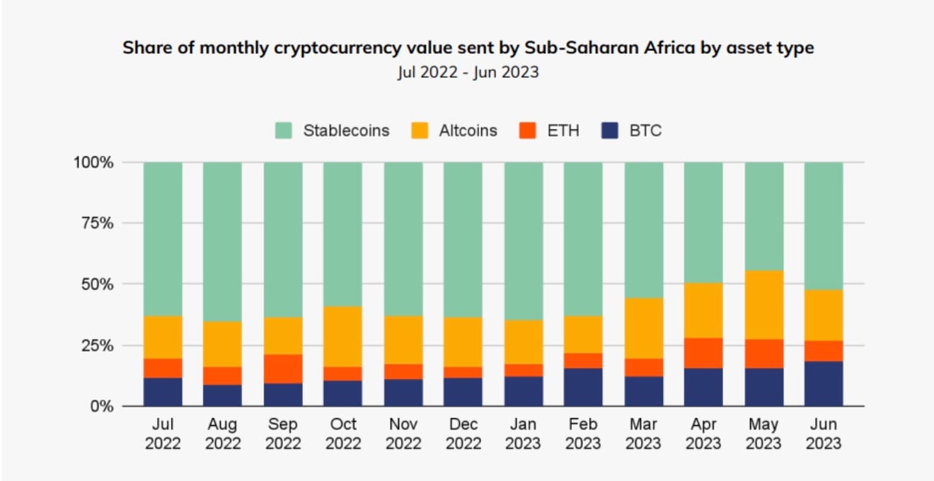 Share of monthly cryptocurrency value sent by Sub-Saharan Africa by asset type