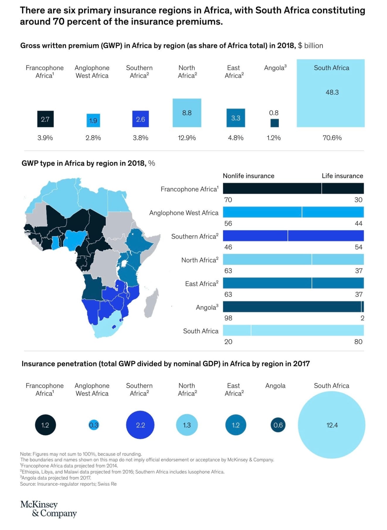There are six primary insurance regions in Africa, with South Africa constituting around 70 percent of the insurance premiums.