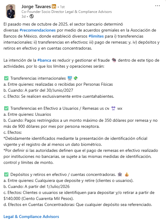 El pasado mes de octubre de 2025, el sector bancario determinó diversas #recomendaciones por medio de acuerdos gremiales en la Asociación de Bancos de México, donde estableció diversos #limites para i) transferencias internacionales; ii) transferencias en efectivos; iii) pago de remesas; y, iv) depósitos y retiros en efectivo y en cuentas concentradoras. La intención de la #banca es reducir y gestionar el fraude 🐀 dentro de este tipo de actividades, por lo que los límites y operaciones serán: ✅ Transferencias internacionales 🖥️💸 a. Entre quienes: realizadas o recibidas por Personas Físicas b. Cuando: A partir del 30/Junio/2027 c. Efecto: Se realicen exclusivamente entre cuentahabientes. ✅ Transferencias en Efectivo a Usuarios / Remesas 🇺🇸 🇨🇳 🔛 🇲🇽 a. Entre quienes: Usuarios b. Cuando: Pagos restringidos a un monto máximo de 350 dólares por remesa y no más de 900 dólares por mes por persona receptora. c. Efectos: *Debidamente identificados mediante la presentación de identificación oficial vigente y el registro de al menos un dato biométrico. *Por definir si las autoridades definen que el pago de remesas en efectivo realizado por instituciones no bancarias, se sujete a las mismas medidas de identificación, control y límites de monto. ✅ Depósitos y retiros en efectivo / cuentas concentradoras. 🏦 💰 a. Entre quienes: Cualquiera que deposite y retire (clientes o usuarios). b. Cuando: A partir del 1/Julio/2026 c. Efectos: Clientes o usuarios se identifiquen para depositar y/o retirar a partir de $140,000 (Ciento Cuarenta Mil Pesos). d. Efectos en Cuentas Concentradoras: Que cualquier depósito sea referenciado. Legal & Compliance Advisors