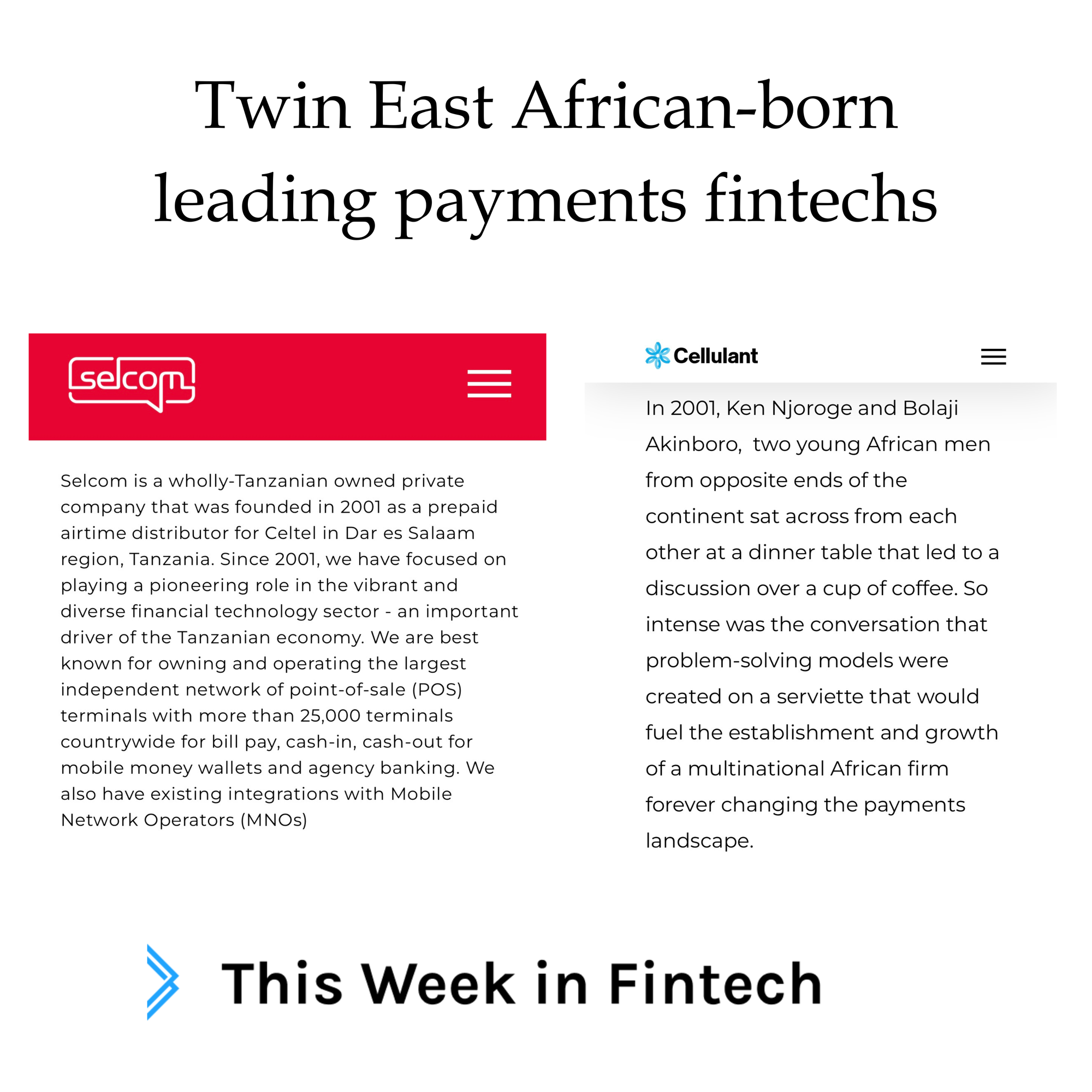 Both didnโ€™t start with payment services; Selcom began as an airtime distributor while Cellulant started as a ringtones seller.
