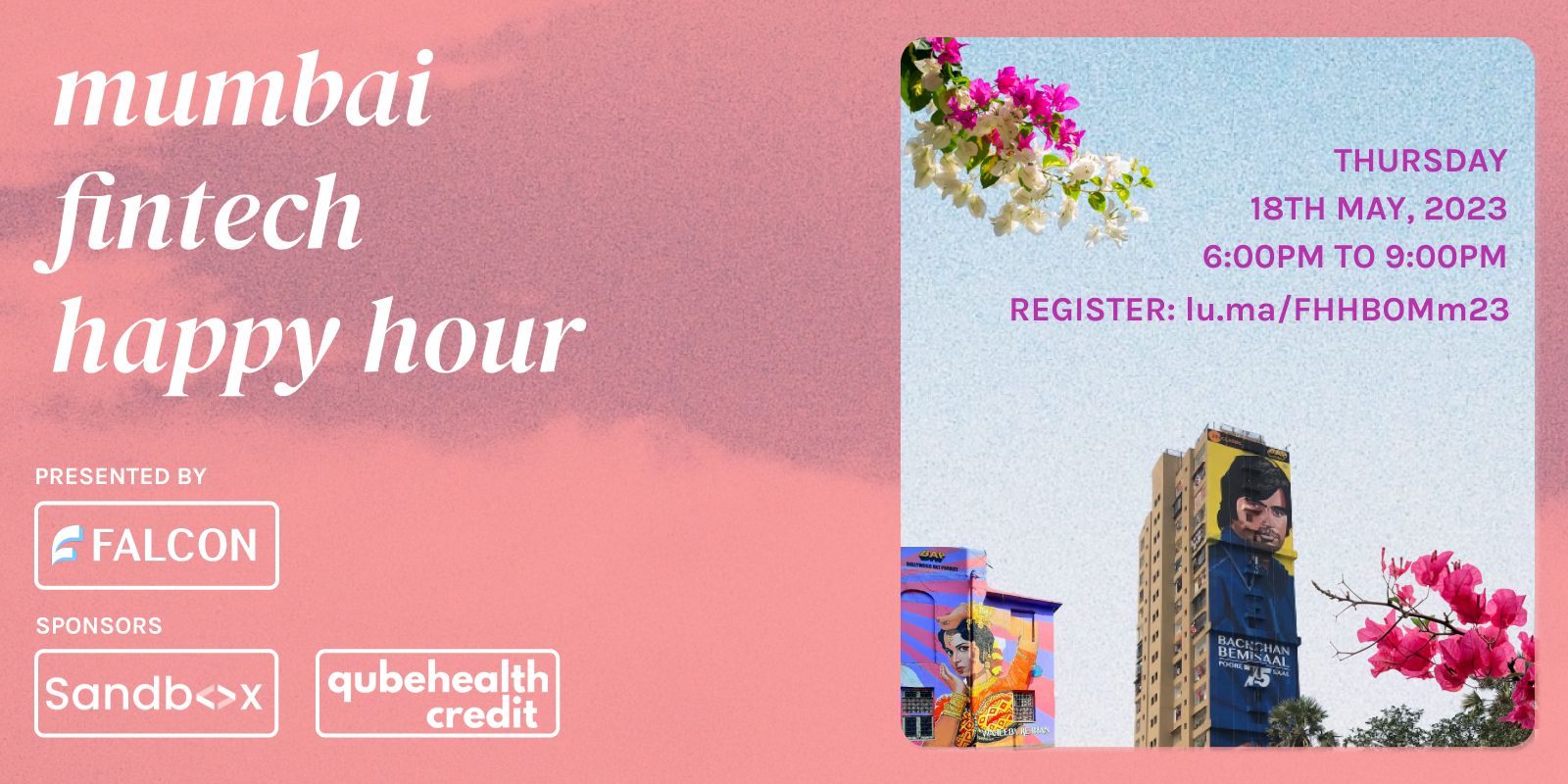 We're bringing the Fintech Happy Hour presented by Falcon to Mumbai - India's financial capital on 18th May, 2023. Mumbai has always had the best mix of attendees including founders, product builders, banking executives, investors and more. We're excited to bring together the entire ecosystem for a fun evening.