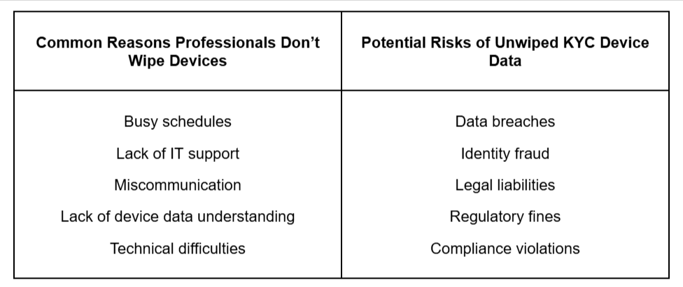 Decommissioned KYC devices can pose security and compliance risks if not handled properly. Refining data wiping protocols, verifying authorized users, and putting proactive security measures in place will protect customer data before, during and after they no longer need their fintech devices.