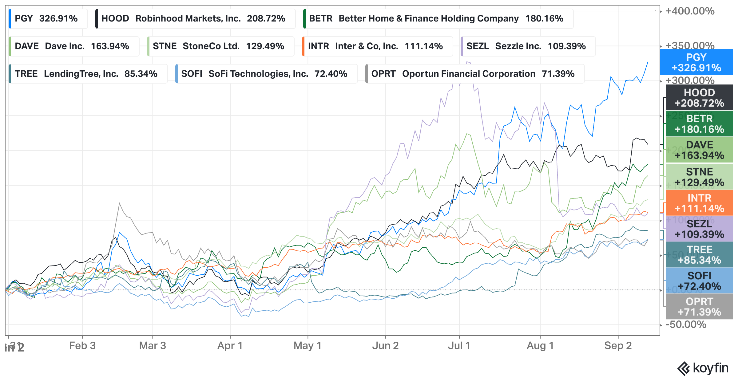 In February, I wrote, "The best-performing fintech stocks in 2023 were Affirm, Coinbase, and MoneyLion. The best-performing stocks in 2024 were Sezzle, Dave, and Zip. Do you see a pattern here? These companies were left for dead at some point. Will 2025 be different? Could Better, Pagaya, or Oportun top this year's list?"