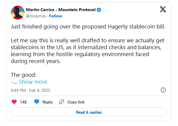 But the biggest news this week was the Senate Banking Committee's proposed legislation to establish a regulatory framework for stablecoins in the US. It's incredible how quickly legislators have moved to pave the path for sanctioned regulated stables over the past three weeks. The GENIUS Act from US Senator Bill Hagerty has a few interesting proposals that would make stablecoin issuance operate more like deposit banking: