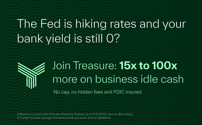 Turn your company finances into meaningful revenue. Treasure Financial™ has built a platform to help safely grow your business idle cash. Get the engine of big business corporate finance to work for you without having to spend time and effort. Get access to 15x more on your cash in less than 15 minutes without any compromise on liquidity. Learn more.