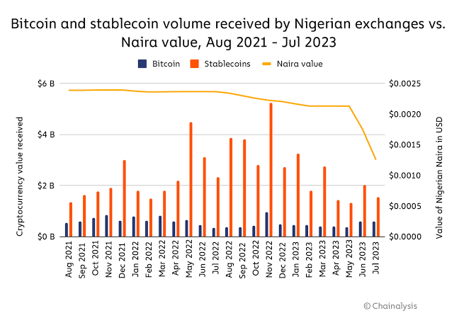 Bitcoin and stablecoin volume received by Nigerian exchanges vs Naira value, Aug 2021 - Jul 2023