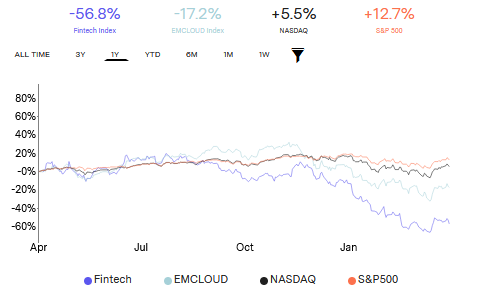 According to the Fintech Index, global public fintech startup stock prices are down -57% compared to the Cloud Index (index of cloud companies) -17.2%.