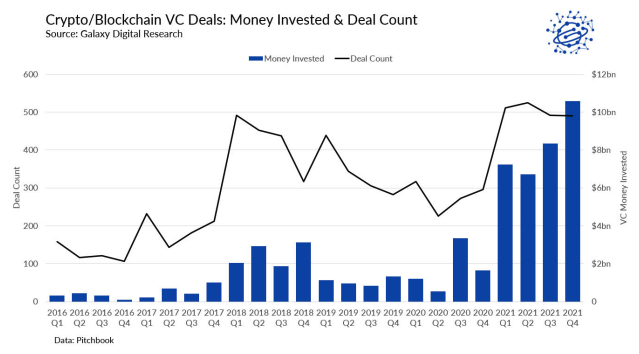 According to a report by Galaxy Digital Research, in 2021 $33 billion of VC went to crypto, blockchain, and defi startups around the world.
