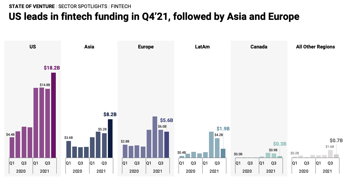 In 4Q21, an average of 14 fintech deals were announced every day.  That would be $387,777,777 raised every 24 hours.  Global fintech funding in 2021 reached a new record of $131.5 billion across 4,969 deals. 🤯 (Source)