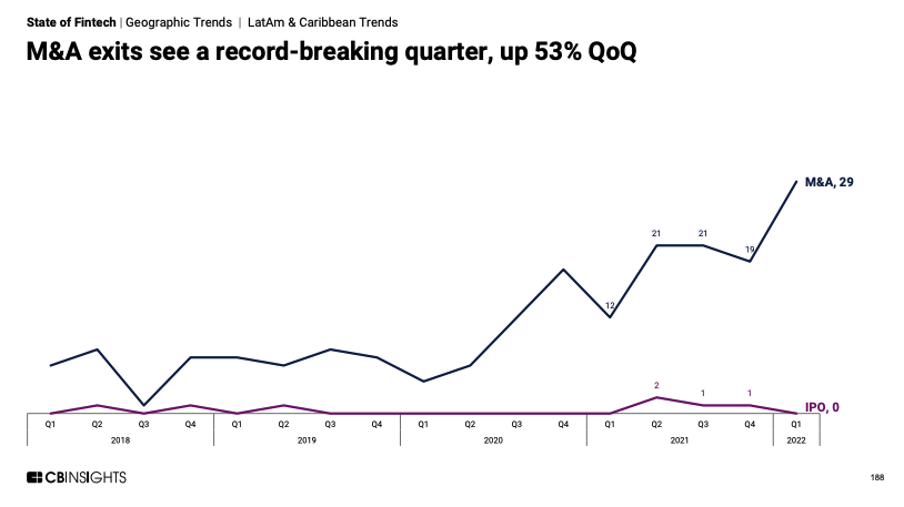 Latam saw a record-breaking quarter for mergers and acquisitions (M&A), with 29 transactions in Q1 2022.  (Source)