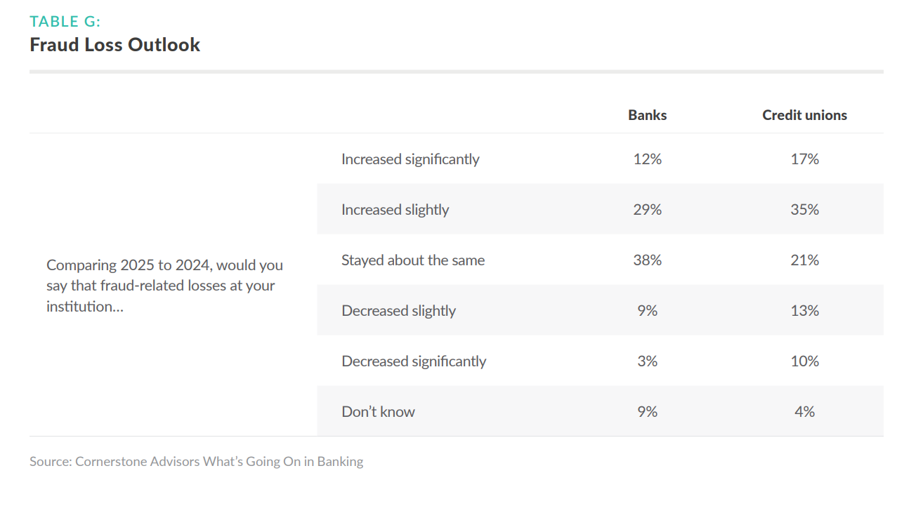 Cornerstone Advisors published their annual What's Going On in Banking study this week. It’s an eye-opening report—based on a survey of 416 senior executives at banks and credit unions, the fraud headline is blunt: roughly 40% of banks and 50% of credit unions reported higher fraud losses in 2025, and most expect it to worsen in 2026. First-party fraud—customers defrauding their own bank—now accounts for more than 40% of total losses. Three-quarters of institutions are increasing fraud prevention budgets in response.