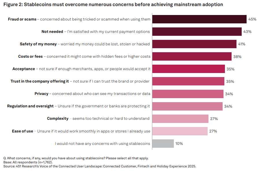 According to the “2026 Trend in FinTech” Report by S&P Global, a key challenge for the mass adoption of stablecoins is the lack of consumer trust. 45% of respondents are concerned about being scammed when using them, 43% worry their money could be lost, stolen or hacked, and 35% are unsure they can trust the provider. For stablecoins, closing this trust gap remains key to broader adoption.
