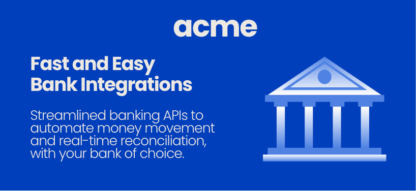 Have you ever felt pain from manual finance processes or high card payment costs? Or maybe you're looking for levers to optimize revenue. Meet Acme Technology. Our software enables you to connect directly with your bank of choice to automate all your finance and payments processes. Think real-time reconciliation and direct-to-bank payments. No lengthy integration, just streamlined APIs that transform your bank integration into a Stripe-like experience.