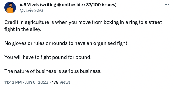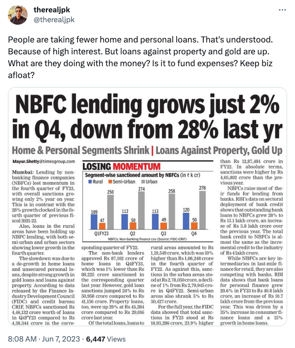 5. NBFC industry lending grew 2% YoY in Q4 FY23 (ended 31st Mar, 2023) to INR 4,46,132cr ($ 54bn) but full year lending grew 24% YoY to INR 16,93,286cr ($ 205bn).