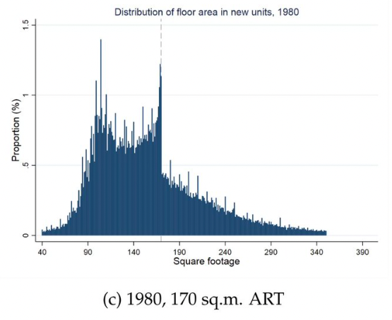 In the late 1970s, France started to require an architect for every new home with over 170 sq m of floor space. Here is the distribution of new home sizes after the change. (Source)
