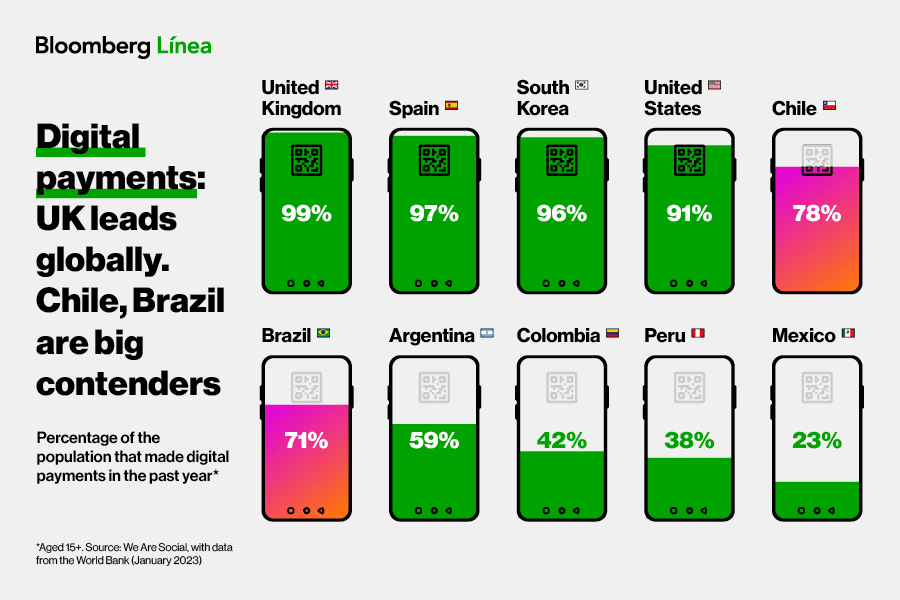 In Latam, Chile leads the way with 78% of its population making digital payments, followed by Brazil at 71% and Argentina at 59%. These countries demonstrate the highest adoption rates of digital payment methods in the region.
