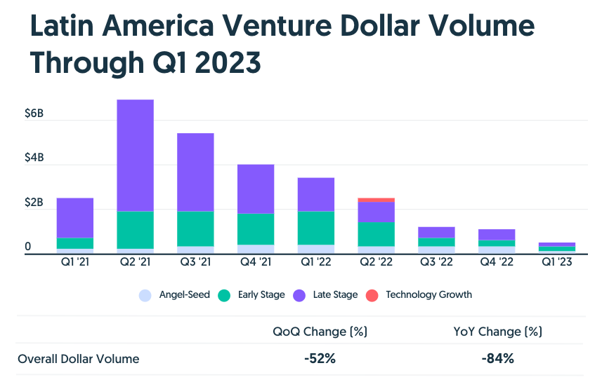 Per Crunchbase, overall investment dollars in Latam startups fell -84% year over year to $500 million while the number of transactions fell -71% to 129 deals. Read it here: https://news.crunchbase.com/venture/latin-america-vc-funding-q1-2023/