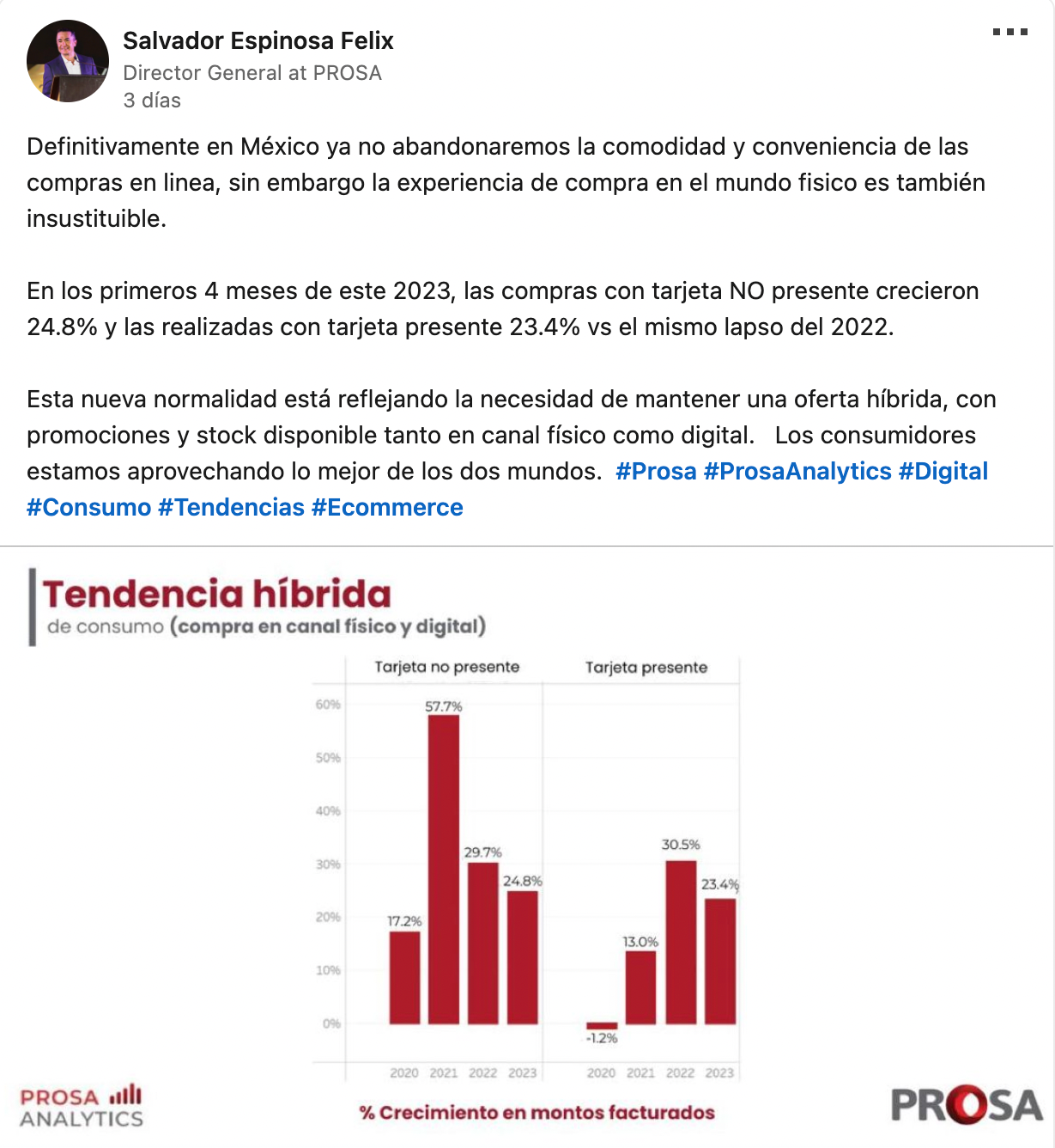 E-commerce is here to stay: per Prosa data, in the first four months of 2023, card-not-present transactions grew 24.8% year-over-year while card-present grew 23.4%.