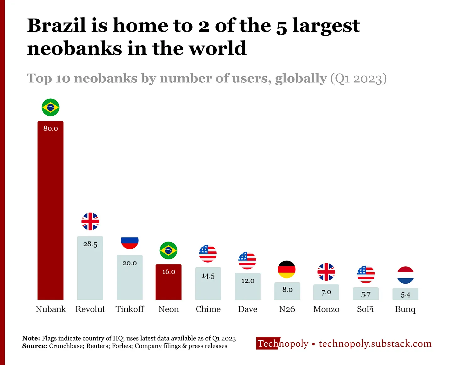 Brazilian neobanks Nubank and Neon have amassed a customer base of 96 million people compared to a combined 101 million customers amongst the cumulative customer base of all other neobanks in the Top 10 (Source)