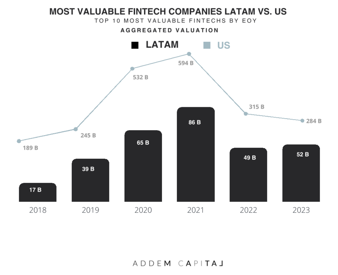 The valuations of fintech companies in Latam are inching closer to the US every year and even while Latam is recovering, in the US they continue to fall. In 2018, the value of valuations of fintechs in Latam represented 9% of that of the US, in March 2023 it represented 18% (Source)