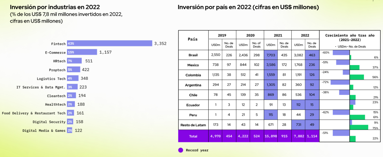Of the US$7.8 billion invested in Latam during 2022, 43% were in Fintech, with Brazil and Mexico being the countries with the most deals and investment (Source)
