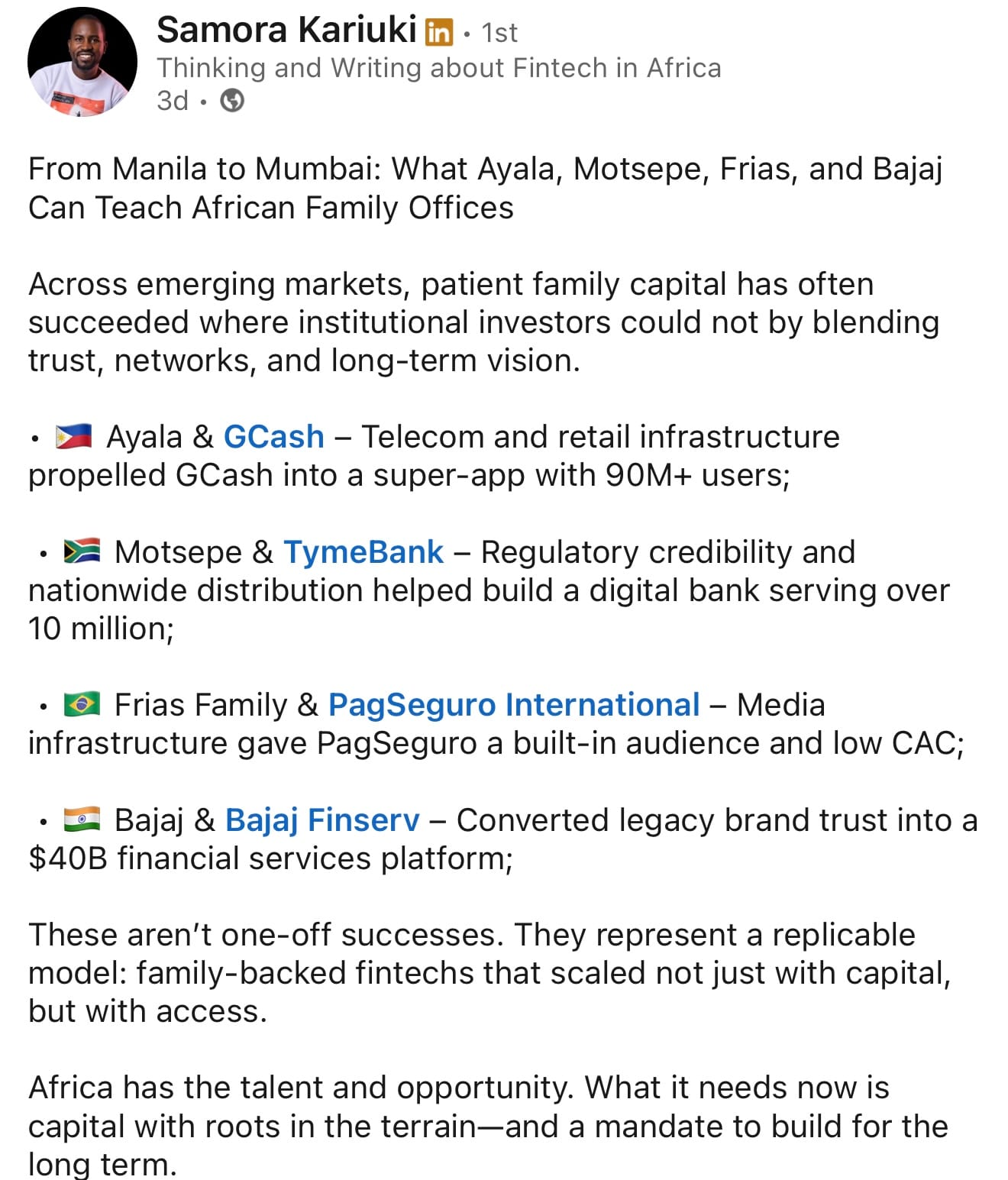 • “Across emerging markets, patient family capital has often succeeded where institutional investors could not by blending trust, networks, and long-term vision”