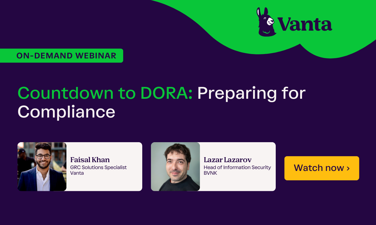 The Digital Operational Resilience Act (DORA) framework helps financial companies withstand, respond to and recover from disruptions and threats of all kinds. Vanta automates the process, getting you compliant in a fraction of the time.