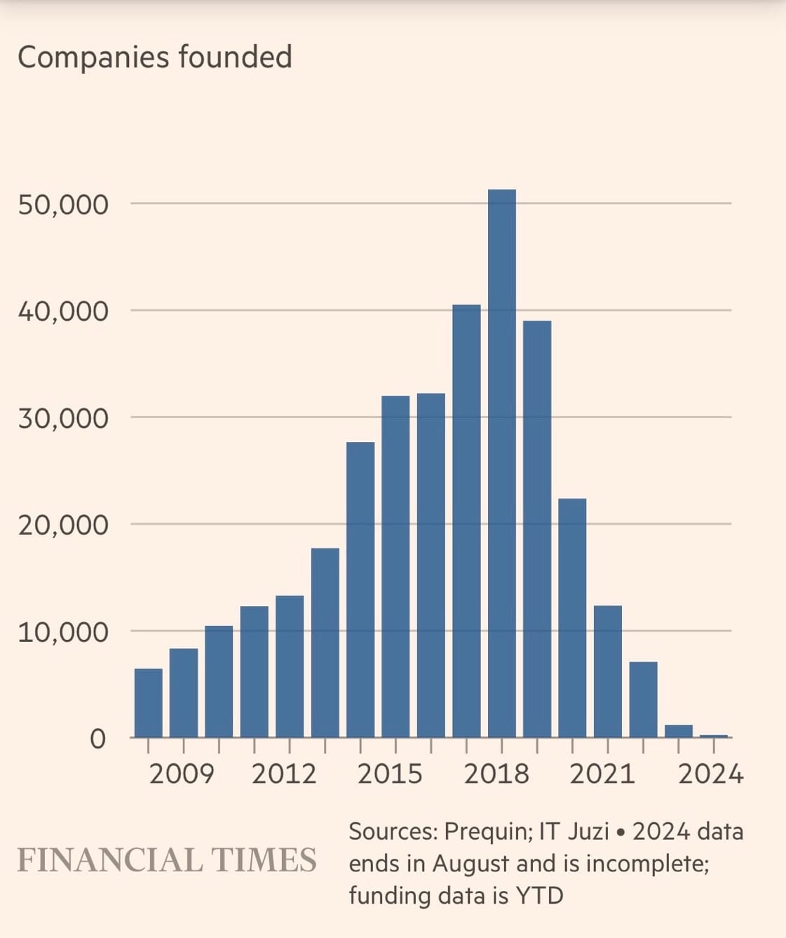 The number of Chinese startups founded in recent years has plummeted. According to FT, Chinese entrepreneurs are hesitant to launch new ventures due to the weakening economy, strict government regulations, and increasingly unfavorable terms offered by venture capitalists, particularly state-owned ones.